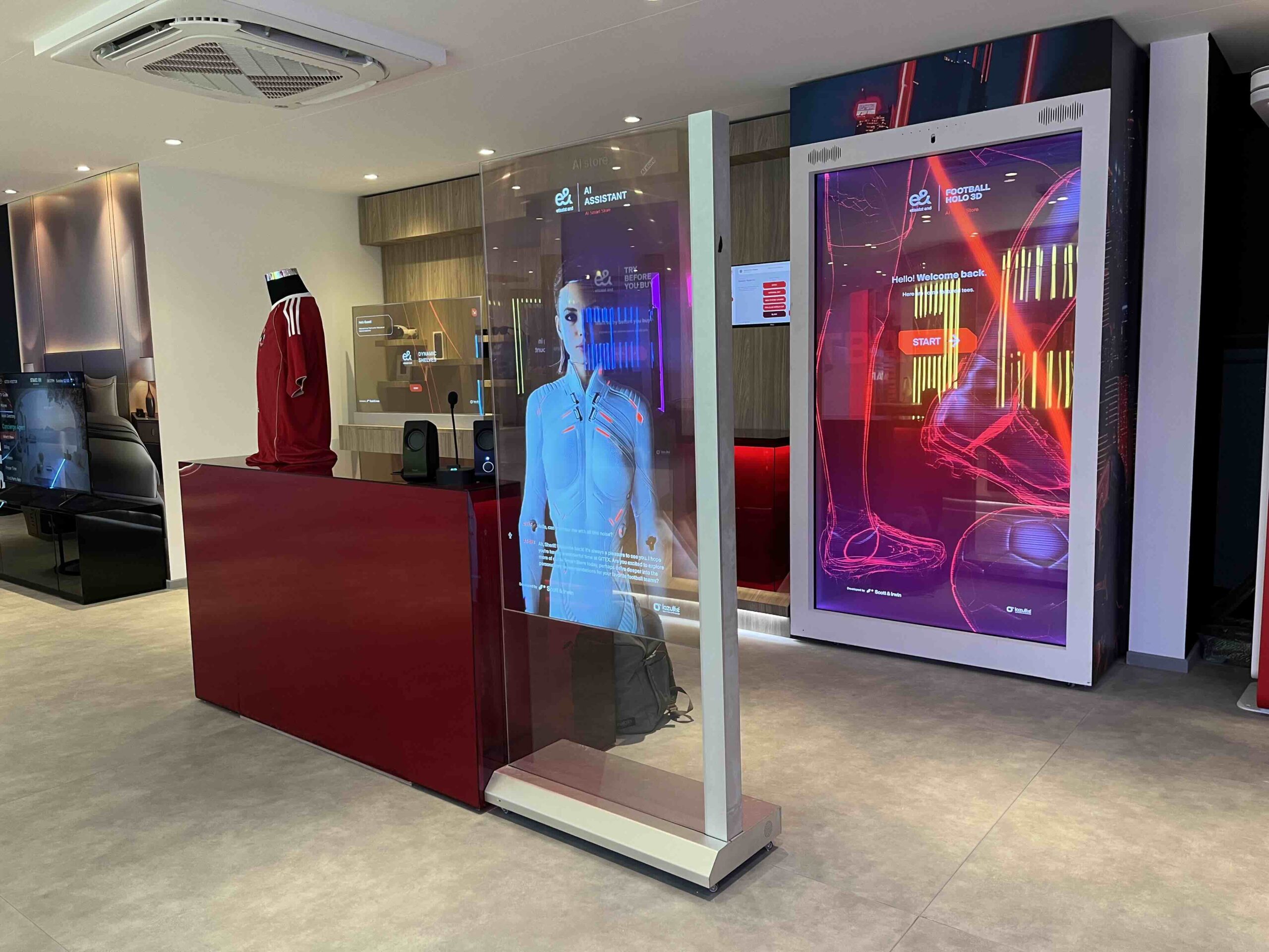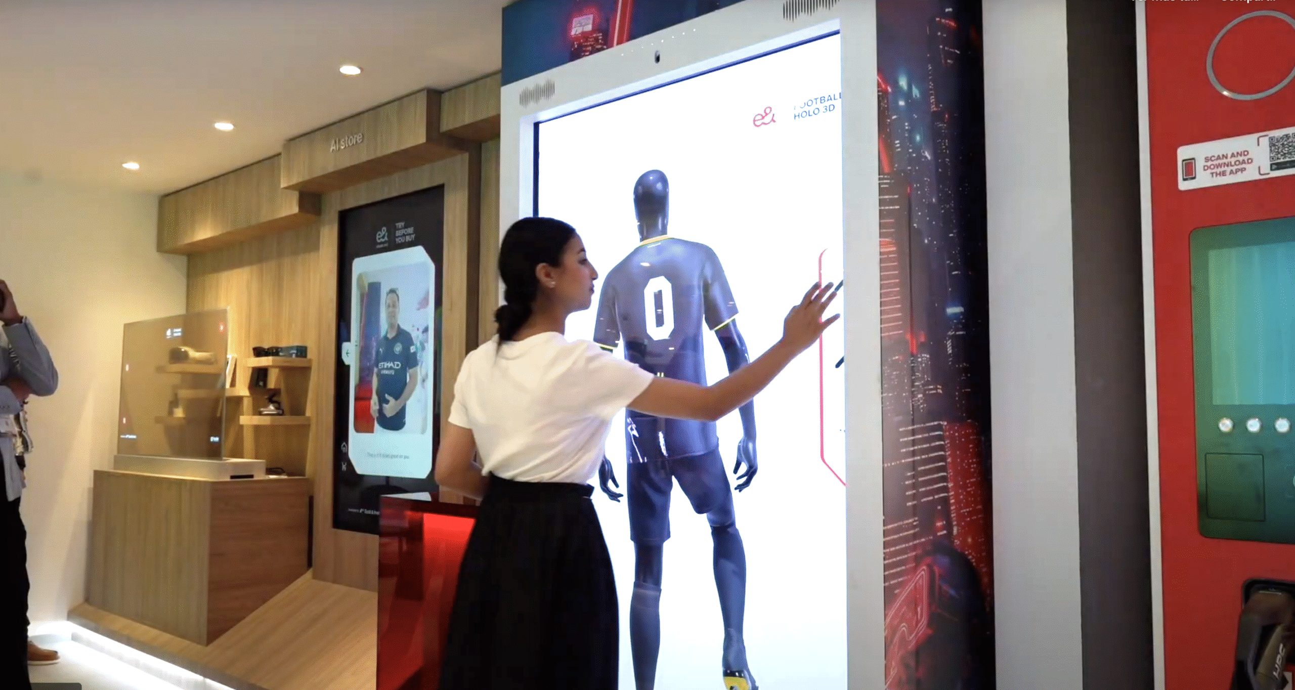 Una pantalla Holo 3D donde puedes personalizar la camiseta de tu equipo de futbol, así como ponerle tu nombre y dorsal favorito. Todo ello mientras lo visualizas en un maniquí virtual interactivo y así ver el resultado.